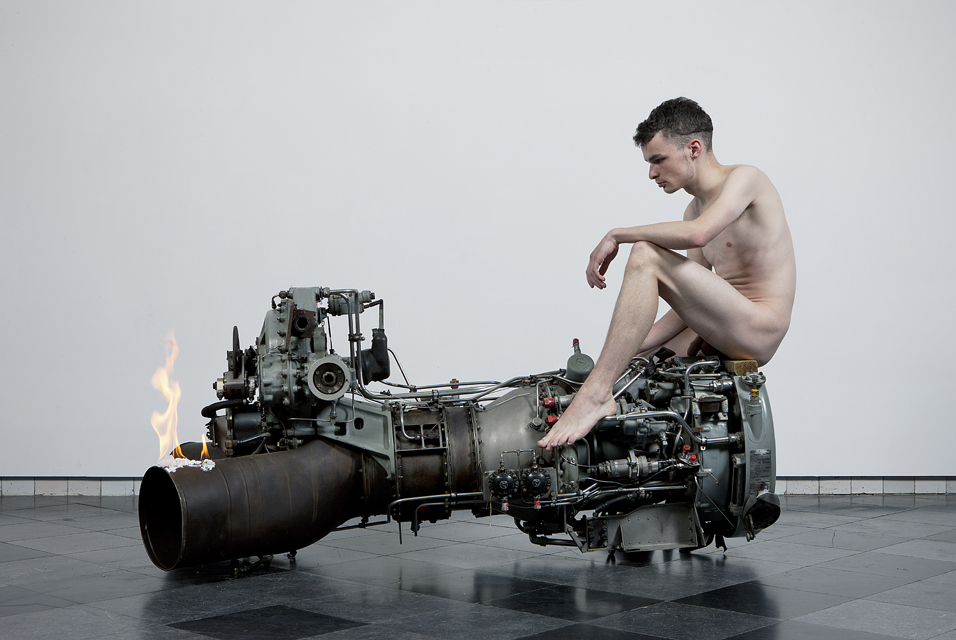 Jet engines often occur in Hiorns’ work. By injecting a US military aircraft engine with anti-depressants, he toys with the possibility of affecting some kind of robotic nervous system, reflecting his ongoing interest in the anthropomorphism of machinery. In his Youth series (1999 to the present), the encounters between a jet engine and a naked young man suggest not only mysterious communion, but also melancholy. Ripped from the wing of an aeroplane, and partly dismantled, the engine is positioned like a remnant from classical antiquity, instilling awe as if being contemplated at some point in the distant future when air travel as we now know it no longer exists the press release said.