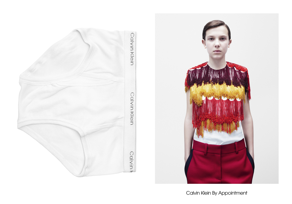 They cleverly all show underwears on the left, the brand’s landmark product, next to a model striking artistic poses on the right. Shot by Willy Vanderperre, some of these models include “Stranger Things” young actress Millie Bobby Brown.