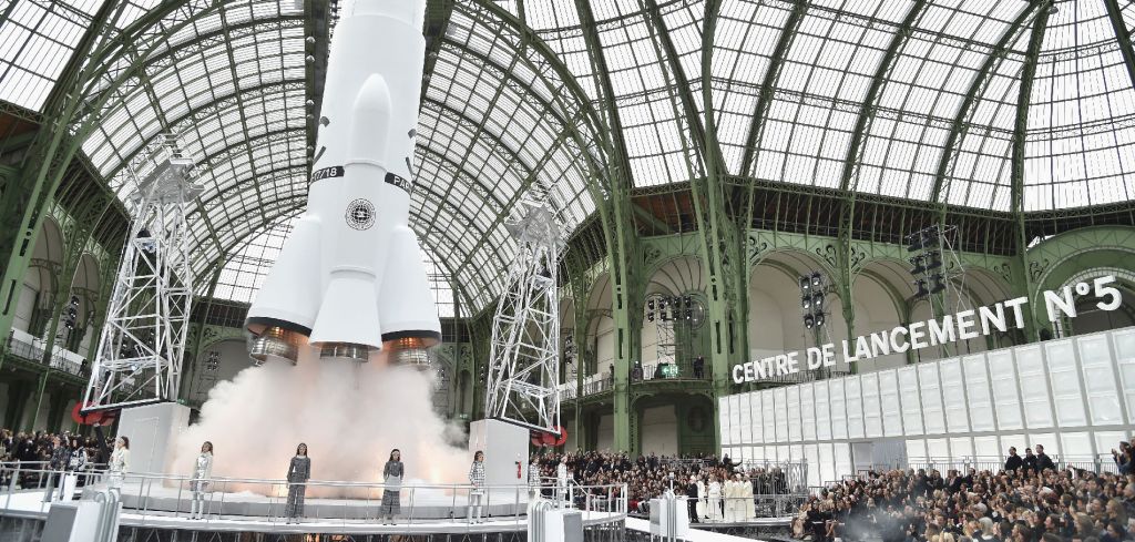 At a time when people follow the adventures of astronaut Thomas Pesquet aboard the International Space Station closely, the cosmos and stars inspire Karl Lagerfeld. While earlier this week, the moon and the comets dotted the patterns of the Dior collection, an homage to Christian Dior’s passion for astrology, the Chanel Ground Control (to major Tom?) collection presented this afternoon in Paris, came to an end with the spectacular launch of a double C stamped-rocket under the glass roof of the Grand Palais. The countdown and take-off orchestrated by Karl were operated from the n ° 5 launch pad, a nod to the brand’s flagship fragrance. The machine rose several meters from the ground, probably one of the best fashion shows ever made. Karl and Chanel took six months to arrange this set.