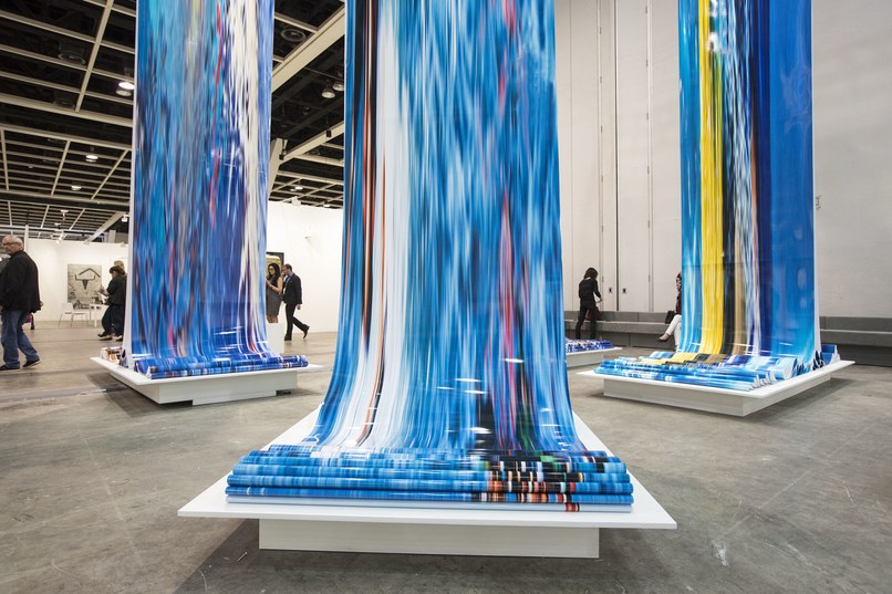 The Deep Blue Sea is a new work by Vietnamese-American artist presented at Art Basel Hong Kong. The art fair closed yesterday evening. The spectacular work shows layers of glossy photographs cascading from the ceiling to folding on a white plinth. But despite the aesthetic side of these works, the message is clearly political. These are single images of the Mediterranean Sea stretched to 150-foot scrolls meant to raise awareness on the refugee tragedies taking place in Southern Europe.