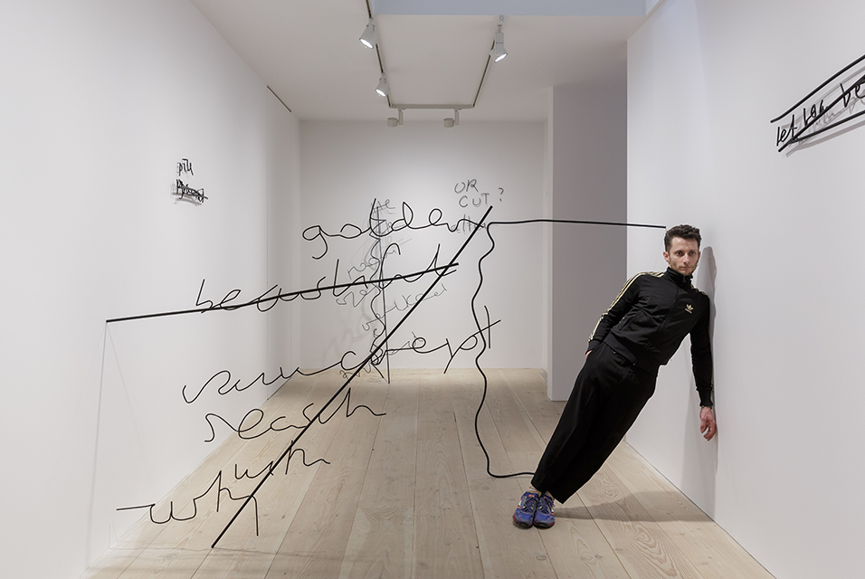 Between Too Soon and Too Late explores the inadequate use of objects, language and the body as tools of communication. In 2015, Alex Mirutziu was part of the group exhibition On Fiction and Reality, representing Romania at the 56th edition of Venice Biennale, Romanian Cultural Institute in Venice.