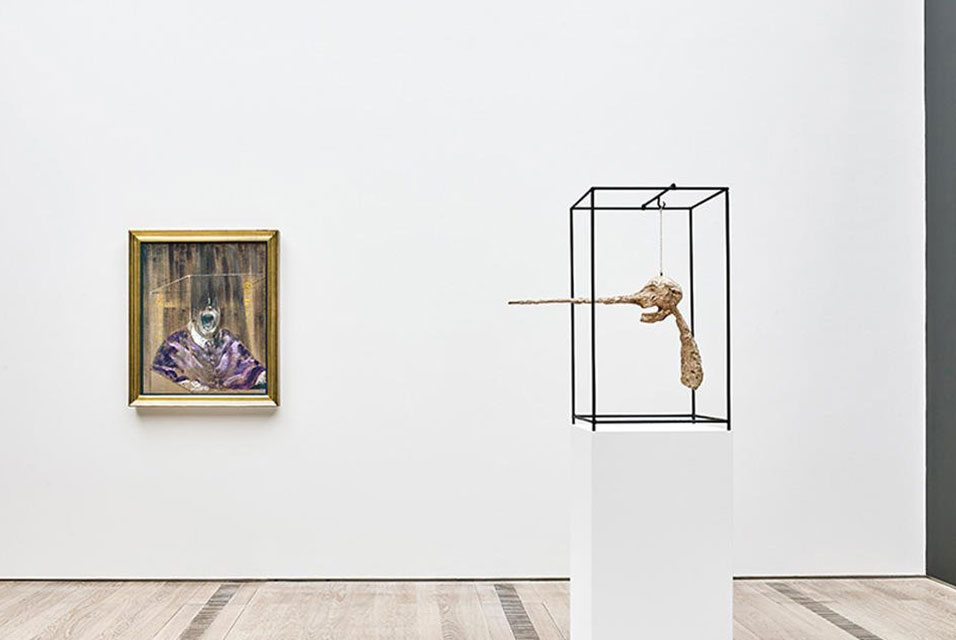 Highlights include a multimedia room which offers spectacular insights into the artists’ studios as well as a series of original plaster figures from Giacometti’s estate that have never been publicly displayed before, and four triptychs by Bacon. Giacometti created a series of sculptures incorporating rectangular frames, including La Cage (1950), which is exhibited in plaster and bronze versions. Two further structures of this kind by Giacometti are also on view in this impressive exhibition: the legendary Surrealist sculpture Boule suspendue (1930), simply constructed but charged with an erotic energy that fired the imagination of generations of art-lovers, and the plaster original of Le Nez (1947-49), consisting of a caged head, suspended by a wire, with a petrified scream and an exaggeratedly long nose that will inevitably remind most viewers of the children’s book character Pinocchio. This exceptional exhibition gathers loans by Francis Bacon from major private collections and renowned museums across the world, including the Art Institute of Chicago, the Museum of Modern Art, New York, and the Centre Pompidou, Paris. The Giacometti loans are chiefly from the Fondation Giacometti in Paris.