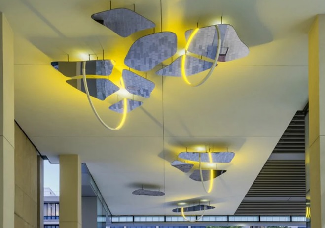 Northwest Passage, spanning 90 feet, is comprised of 30 polished stainless-steel panels, each of a different size and abstract shape, installed on the breezeway ceiling of the space, floating above visitors to MIT.nano (Building 12). These mirrored forms base their silhouette and configuration on the pattern of free-floating ice, the product of thinning ice coverage, found in the Northwest Passage between North America and the Arctic Circle. Seven semi-circular rings, each lined with an LED light and diffuser, are reflected in the mirror panels, creating the appearance of complete circles of light. This optical illusion elicits further inspection from the viewer, inviting them to enter the passageway and the connected university buildings.