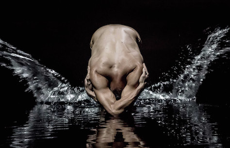 Inspired by the body’s composition predominately being made up of water, the near-naked dancers inhabit a flooded stage, both reflected and hidden by its mirror-like surface.