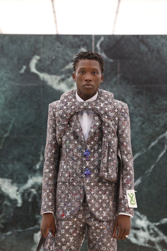 Louis Vuitton also places green issues at the core of its conceptual framework with the Upcycling Ideology, introduced in the previous collection. “In a fast-paced and fleeting time, repetition equals documentation: gestures made and lessons learned. The Fall-Winter 2021 collection exercises the three approaches of the Upcycling Ideology across fabrications, techniques and themes. The LV emblem exercised to imbue the “old” with new value, the Upcycling Signal Logo launched in the previous storyline is carried over in the collection.”