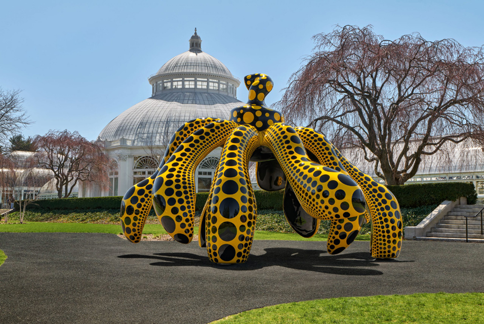 In and around the Enid A. Haupt Conservatory, Kusama’s work sits among the seasonal profusion of violas and chrysanthemums, while her plant-inspired, polka-dotted sculptures are placed among meadow grasses, bellflowers, and water lilies, including Hymn of Life—Tulips (2007) in the Conservatory Courtyard Hardy Pool.