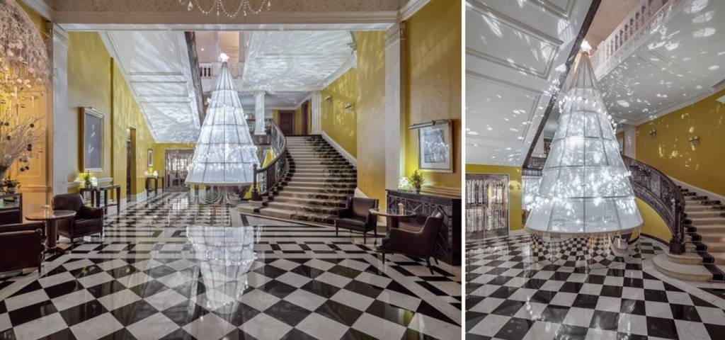 Titled ‘The Celestial Snow Globe’, Claridge’s holiday tree, designed by Dior Homme designer Kim Jones recalls the emblematic toile of the Dior Haute Couture Ateliers and traditional pleating techniques. Projections radiate from the base, upwards and beyond the tree, creating magical visuals around the space and up to the famous hotel staircase.