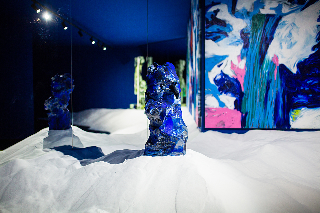 CUEVA DE COPAL, is a new and immersive site-specific installation drawing on the architecture of the space and plunging visitors into a sound and cocoon-like environment made of sand, blue paint and organic elements. The installation integrates ideas explored through previous installations, in which Huanca has transformed the masonic temple of Marciano Art Foundation in Los Angeles, the early-18th century palace of the Belvedere Museum in Vienna, and the high desert landscape surrounding the Ballroom Marfa in Texas.