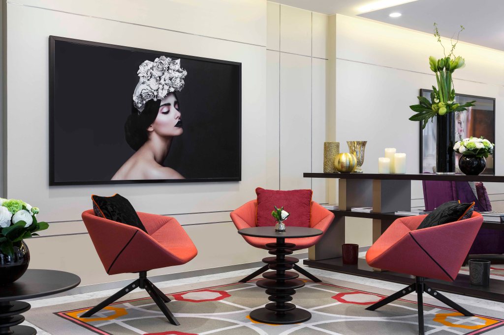 In the entrance of the hotel, in the small waiting area, a vibrant sculpture placed in front of a natural wall, stands proudly to welcome international guests. The larger and very pleasant waiting area, joining the two buildings, features vintage Louis Vuitton trunks, art books, auction catalogues and a selection of framed large-scale fine prints mirroring the large windows of the room displaying natural light. The lovely breakfast area is adjacent to this vast lobby and offers all options for a delicious start of the day, from delicious (Proust) madeleines to scrambled eggs and ham.