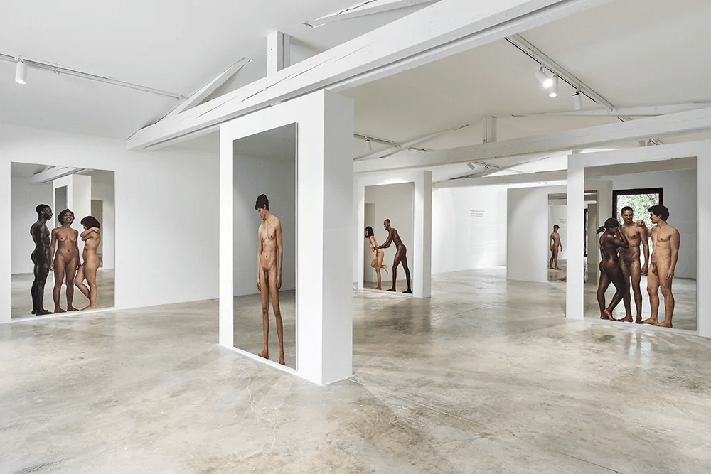 Continuing his famous series at Peyrassol and the ability to reflect the upheavals of the world, the artist serigraphs the naked bodies of people, of different skin colours and ages, on large mirrors installed close to the ground. Rid of their artifices, no social class or border separates them. They hug, touch, kiss, laugh, love each other, respect each other, pay attention to each other. Beauty and kindness guide their gestures here by revealing the distance that sometimes interferes between our daily relationships.
