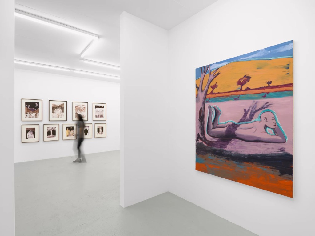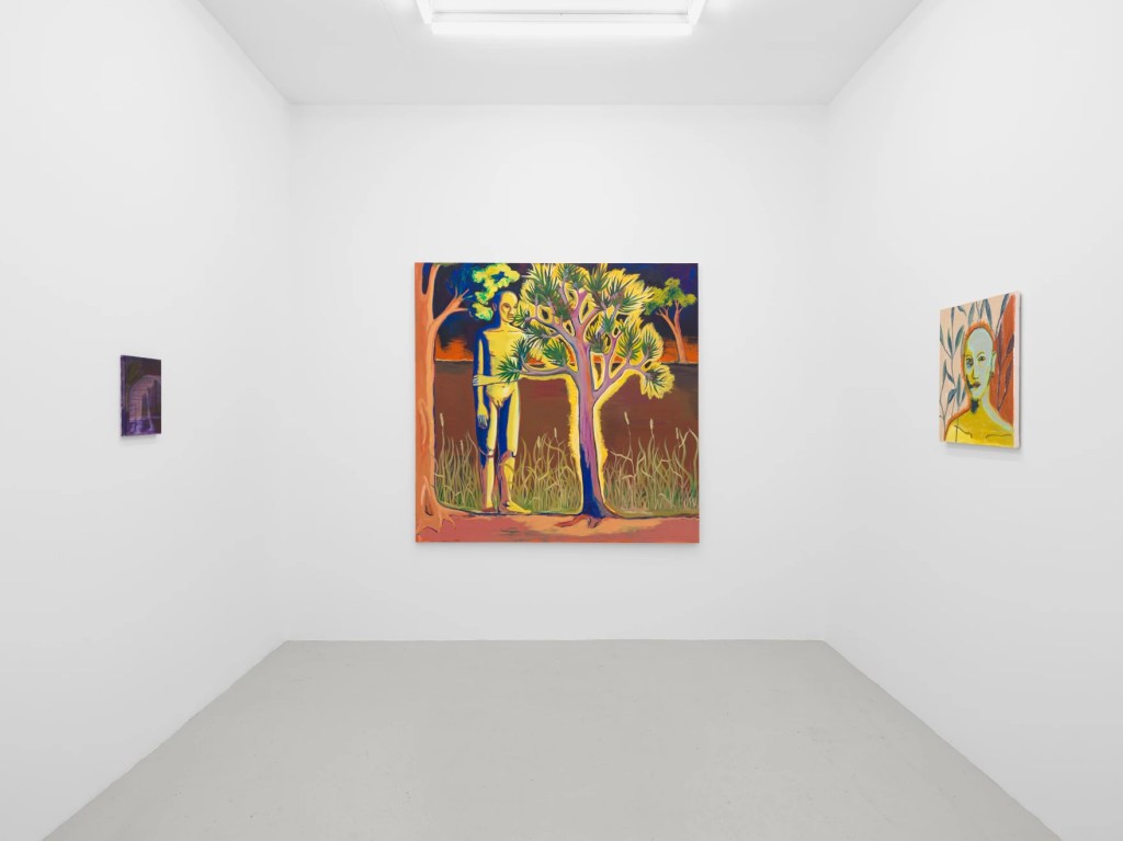 “Our moment is one of climate catastrophe. Onabulé is attuned to rising temperatures and how that “affects our idea of place in the world.” The largest scale work in the exhibition, Burning Man, Burning Tree (2022), represents a paradise set afire, in which human and tree are both engulfed in flames. This fiery presence abstracts the setting while illuminating the two figures – human and tree, side by side. In unsettling the romanticism of the natural environment as pristine, Onabulé experiments with the idea of nature as untouched. The bucolic vision of arcadia is destabilized by the ecological realities of the planet we call home.” Alexandra M Thomas writes about the show.
