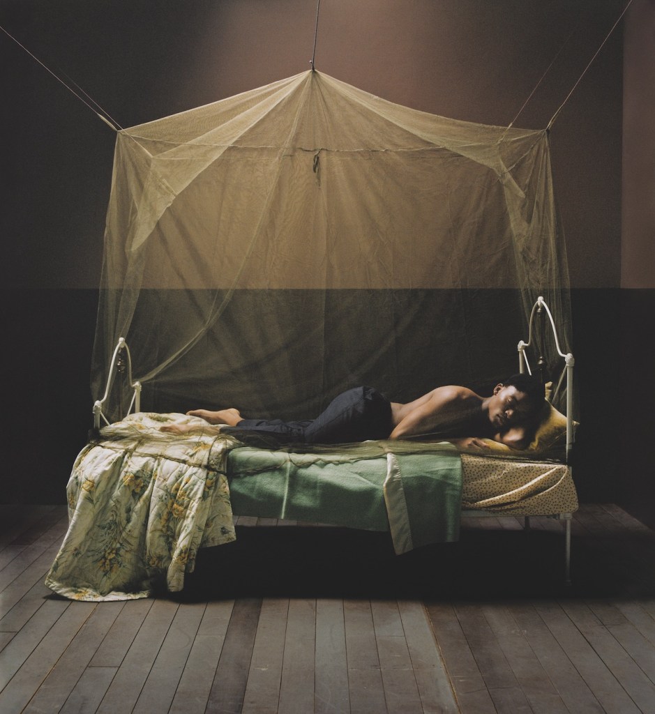 Chrysalis presents images of Black men and women in idyllic states of leisure and repose, safe and unencumbered by social expectations. In a photograph that shares its title with the exhibition, a young man sleeps on a blanket-covered bed, within the protective cocoon of a mosquito net. A Glint of Possibility represents a figure on a tire swing suspended above the surface of a lake, frozen in perfect equilibrium. Treading shows a boy’s head emerging from the same lake as a large bunch of balloons floats in the image’s center.