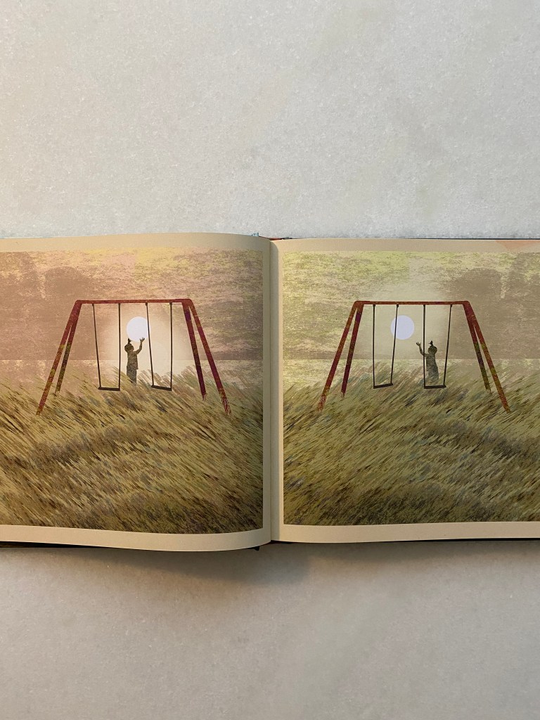 “The swing has always been in this place―ever since I can remember,” the first few lines read. “Here we stood together, looking out to sea, waiting for something to change… for something new, something exciting. But every day was the same.” But as seasons change and years pass, things do change. Friends come and go, lovers meet and kiss, spring turns to autumn, and the swing set grows creaky with age. All of these changes are philosophically conveyed by Teckentrup’s signature collage paintings that employ soft, radiant colors and simple yet powerful compositions.