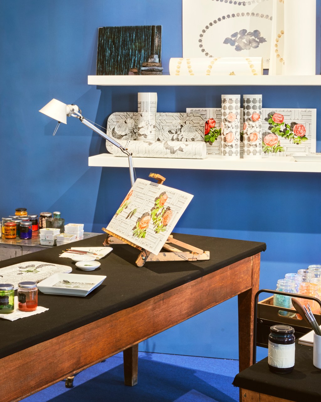 Highlights in Milan include Giro di Conchiglie, a marine-themed decoration inspired by one of the rooms of the villa in Varenna, a home once owned by the Fornasetti family on Lake Como, recognised as one of the ultimate decorative expressions of Fornasetti’s language. Piero Fornasetti devoted himself tirelessly throughout his career to designing the spaces of the villa, from whole rooms down to tiny details. One of the rooms was entirely decorated on a marine theme, with real shells covering the walls, furniture and chandelier. In the Giro diConchiglie collection, the three-dimensionality of the design arises from the play of light of silver, applied manually in leaves by the Atelier’s craftsmen. The striking trompe l’oeil of the shells is accentuated by the blue background, created using a special painting technique with a dripping effect.