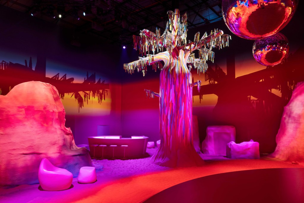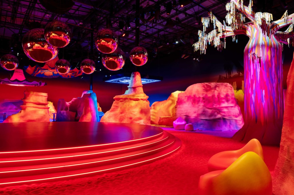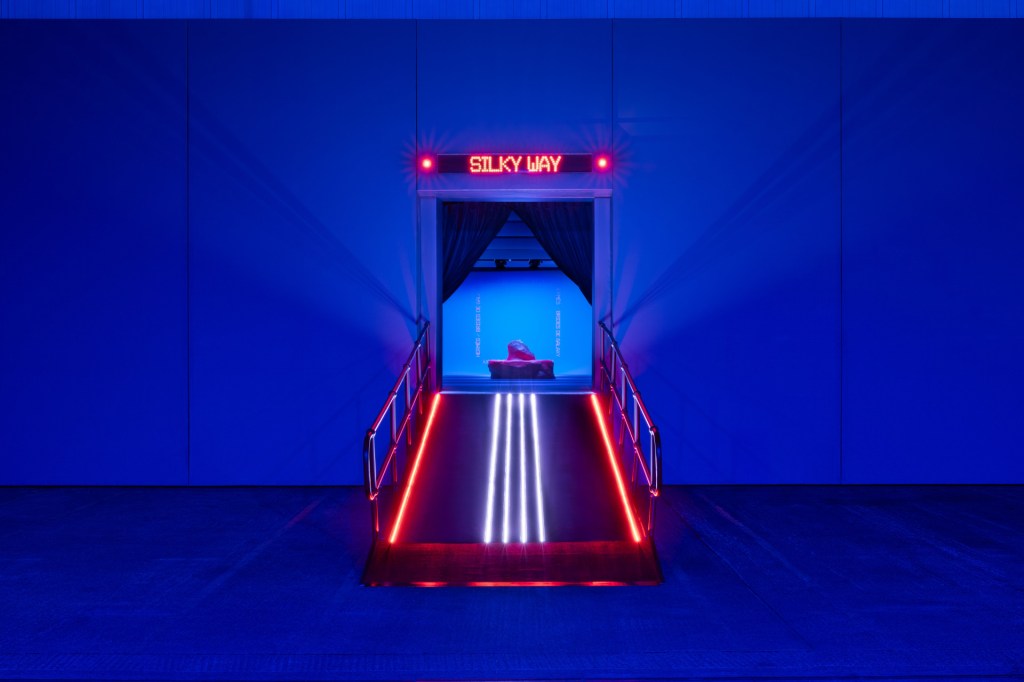 This project resulted in an immersive set that was suggestive of a surreal desert planet. Visitors entered the very instagramable set via the “Silky Way,” a landing strip of lights leading to a Franz West-nspired sculpture. Inside, they found a super-saturated internal topography that featured five separate sections, each representing a different iteration of the scarf over its history.