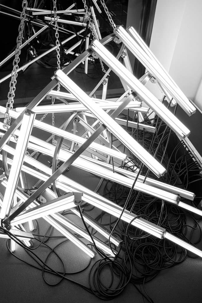 This iteration of the Celine Art Project, which consists of fourteen new works in total drawing parallels with “chandelier structures,” was on display at Celine stores across the globe and in time for the recent festive season. The pieces are all made of three industrial lighting displays that have been nearly completely disassembled. Violette’s mystic palette remains with white lights, black and grey metal. The works are poetic, nostalgic and fierce.