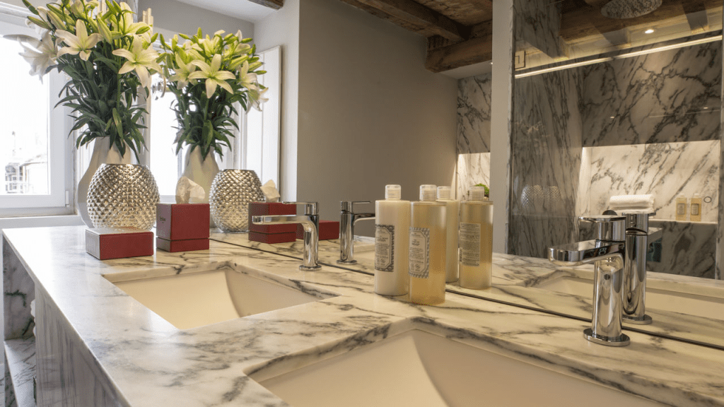 In the room, large table, practical tools and amenities from fridge, plates, coffee making facilities and large cupboards are there. Dare Lisbon House understands the needs of its guests. Bathrooms are spacious and gorgeous with white marble throughout (how luxurious!); lights are subtle and the colour palette enhances the iconic blue tiles on the walls.