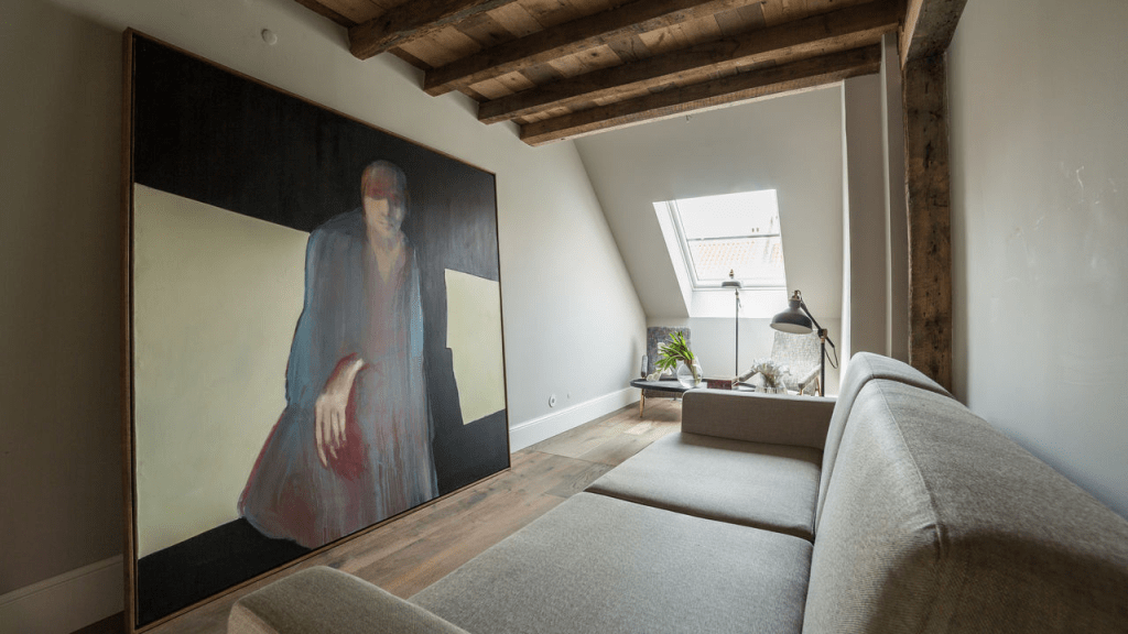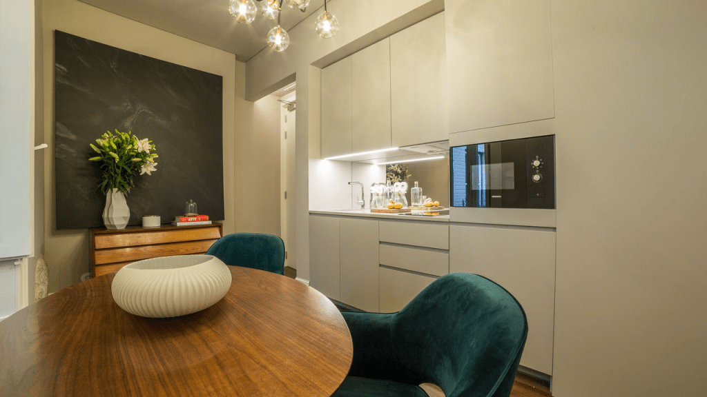 The design and art within the apartments are chosen with a deep sense of aesthetics. The selection is driven by the heart and soul of the family, and they balance art and functionality. “The family has connections with various artists, and my background in the cinema business makes it easy to blend art and design.” Luisa adds. Upon arrival, it’s obvious each piece of furniture and painting on the wall are carefully chosen to enhance the space. The lobby does feel like a cinema set, out of an Almodovar movie.