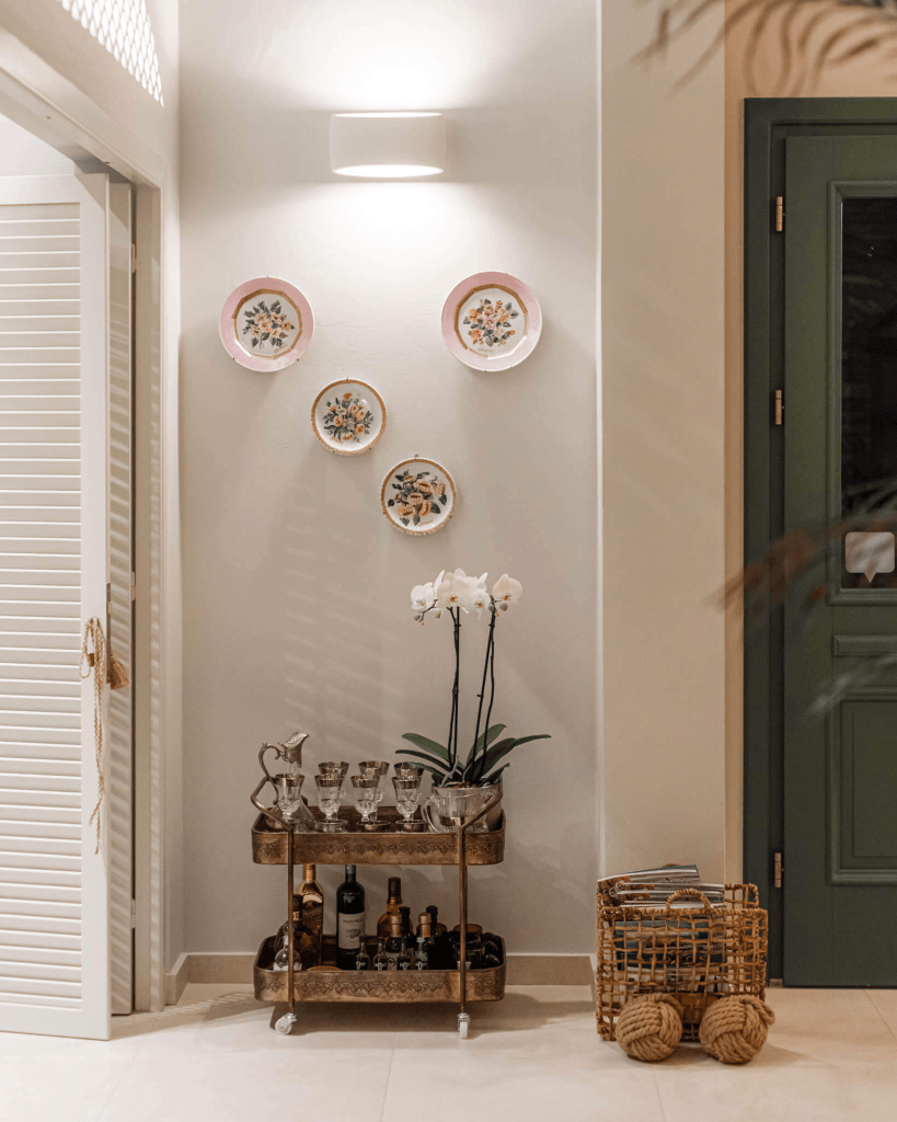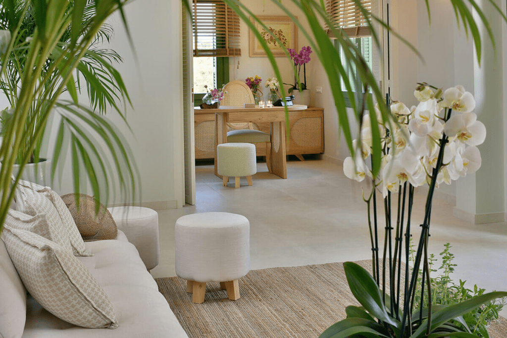 Satisfying visitors’ comfort and respectful to the natural environment, Casa di Fiori features modern accommodations. Upon arrival, the open welcoming lounge area displays a large roof window letting the sunshine through the entire building. It is adorned with gorgeous Cycladic-style lamps, light touches of green, bouquets, and fantastic art pieces on the walls. “The architect I worked with is Mr. Dimitrios Vaxevanakis and I designed the interiors myself, as it is something I am very passionate about.” The lower floor of the main building features an interior working fountain, reminiscent of Roman architecture. “Mr. Dimitrios Vaxevanakis made my architectural vision a reality. He finished his studies in Greece at the Aristotle University and then specialised in Architecture at Politecnico Universita di Milano and worked in Italy for years.”
