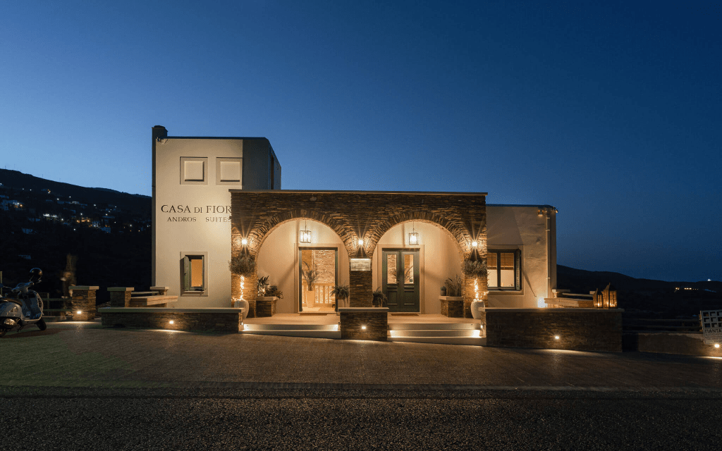 Ms Dertouzou’s impressive décor, generosity, and manicured gardens, its practical location, and grand service, Casa di Fiori Andros Suites is the best Cycladic experience.
