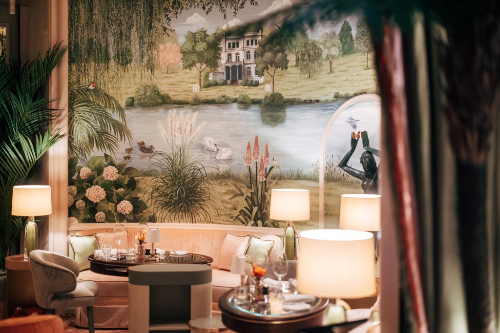 Upon arrival, the hotel features a luxurious perfume boutique by the renowned fragrance house Krigler. Established in 1908, Krigler’s boutique offers a curated selection of their exclusive fragrances, luxury scented candles, and bespoke perfume services. The boutique’s elegant design reflects the hotel’s timeless charm, providing guests with a unique olfactory experience. At the back, mirrors are adjusted according to the hour of the day providing great perspectives over the lounge area. This comfortable room boasts a great chandelier made in Italy.