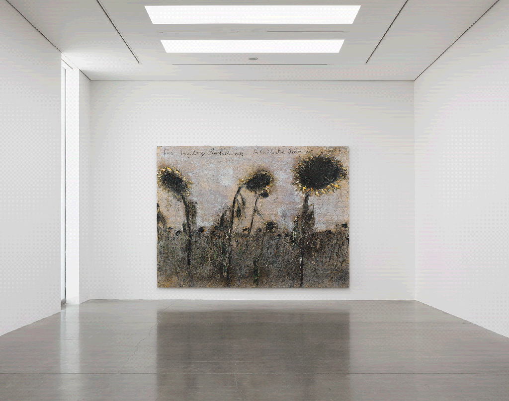 Kiefer’s sunflowers, their heavy heads bowed earthward, seem burdened by the weight of longing. And yet, they endure, rising from the soil with a haunting, almost human presence, reaching toward skies that are at once darkened and luminous. One painting includes a line from William Blake’s 1794 poem Ah! Sun-flower, in which the flower, weary and yearning, dreams of a “sweet golden clime” that fades with each setting sun.