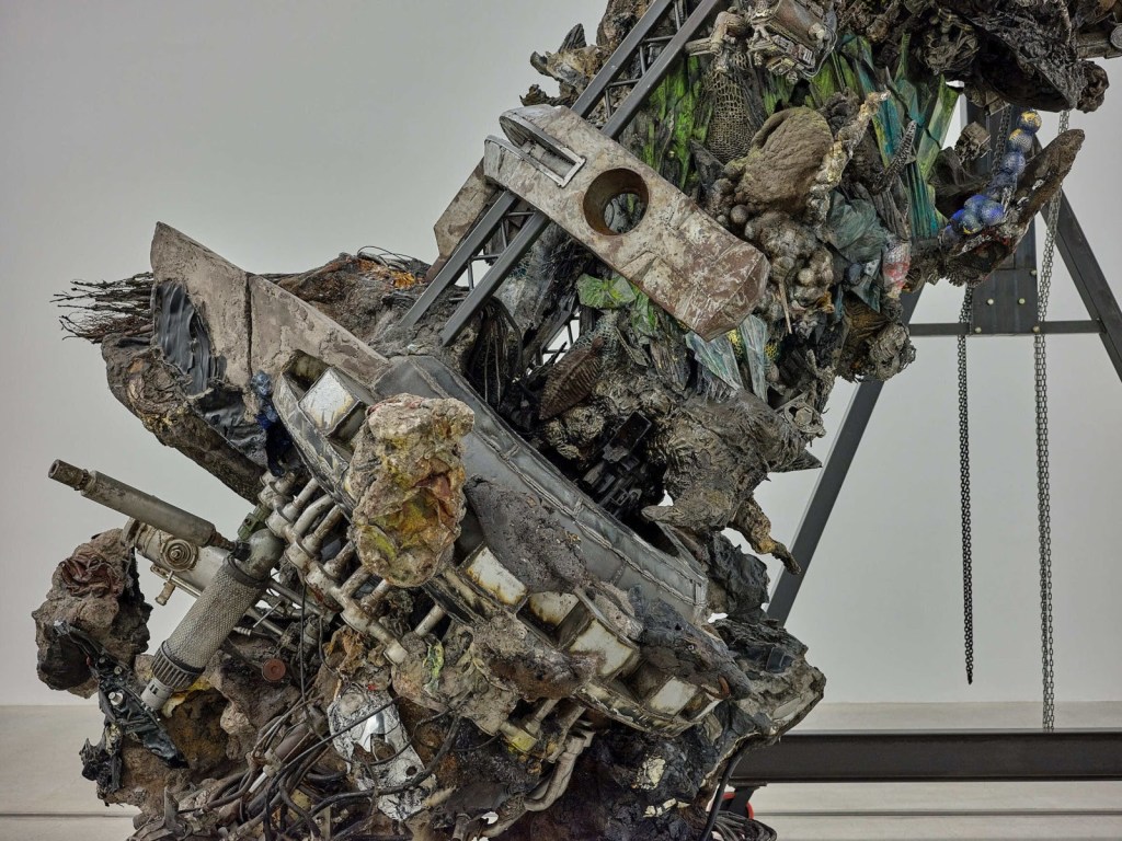 At the core of the exhibition lies a constellation of hybrid, fantastical sculptures from Villar Rojas’s ongoing series The End of Imagination (2022–present), whose uncanny forms evoke relics unearthed from an unknowable future. Previously shown at the Art Gallery of New South Wales (2022), the Helsinki Biennial (2023), and Fondation Beyeler (2024), the series originates from the artist’s “Time Engine”, a custom-built digital simulation that fuses video game technology, artificial intelligence, and speculative world-making. This tool generates imagined worlds inhabited by shifting life forms, architectures, ecosystems, and sociopolitical structures.