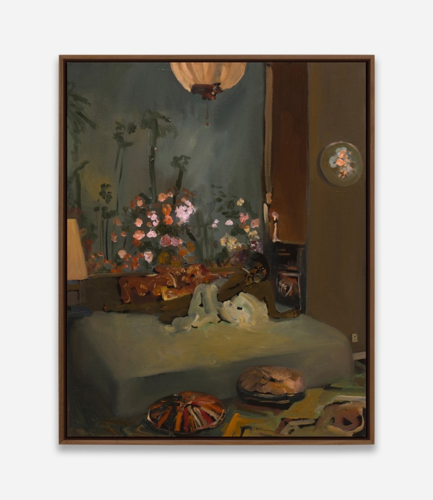 The brushstrokes here are more visceral, the compositions less tightly bound. Curtains whip, rugs dissolve, walls thrum with colour. The environments, she says, “pulse with abstraction”, as if the very air around her subjects is restless with energy. The contrast between the stillness of the figures and the turbulence of their surroundings creates a friction that is electric.