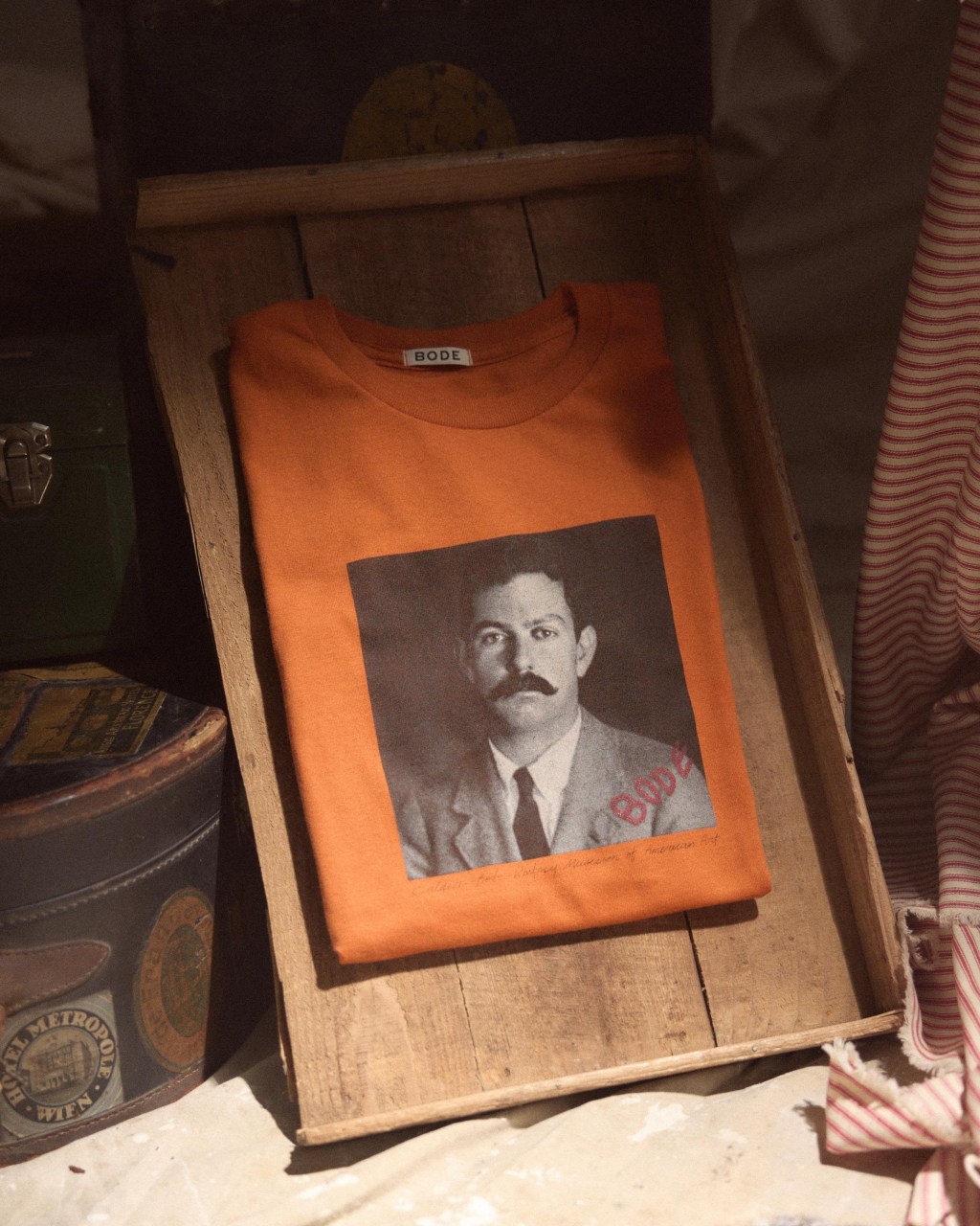 To mark the occasion, BODE has collaborated with the Calder Foundation and the Whitney Museum to create a series of custom pieces inspired by Calder’s Circus. Among the limited-edition items are a T-shirt printed with Calder’s 1926 identity card and an original French critic’s review of Calder’s Circus; hand-sewn brooches inspired by the Lion Tamer and Fanni, the Belly Dancer acts; and a wooden box modeled after the original suitcases used to store and transport Calder’s troupe.