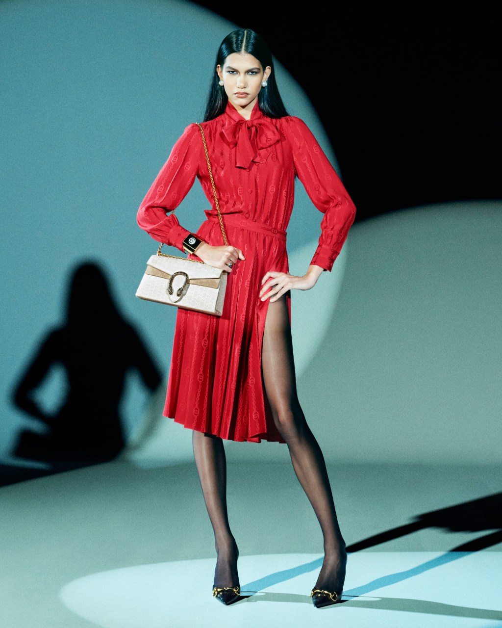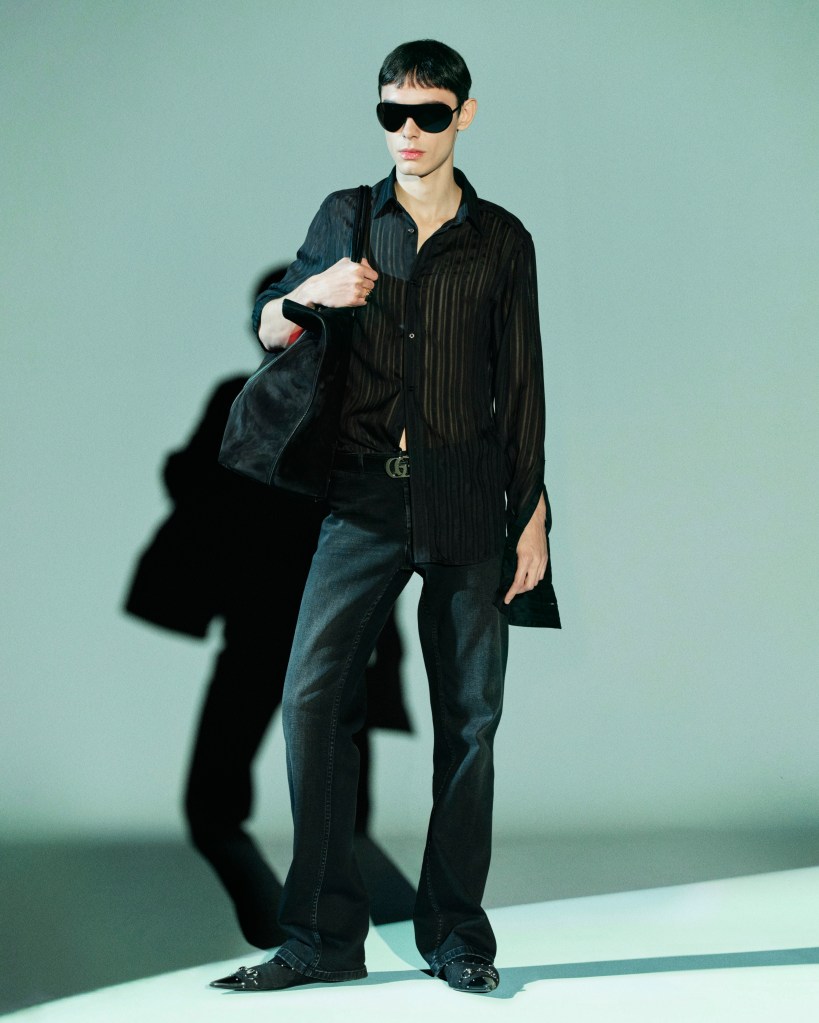 Outerwear becomes highly tactile, coats made from latticed strips of shearling, feathers, goat hair and silk, all arranged atop sheer bases for weightless movement. Partywear leans into intimacy with underwear-inspired pieces, draped minis and fluid jersey gowns. Demna reworks 70s and 90s Gucci signatures through Web-striped racer jackets, sliced Double G belt buckles, full leather and suede looks, and equestrian-print silk ensembles lifted from archival scarves.