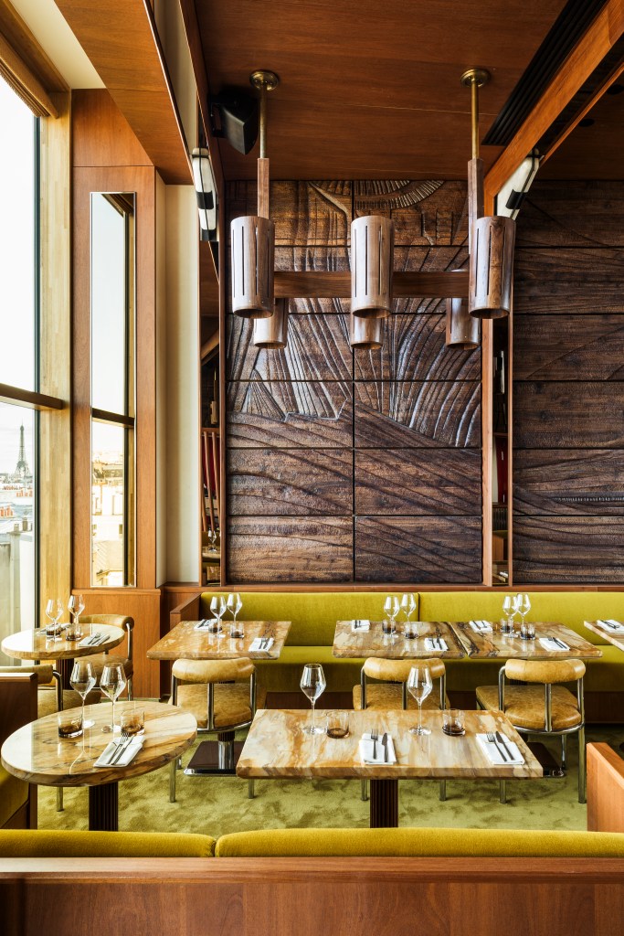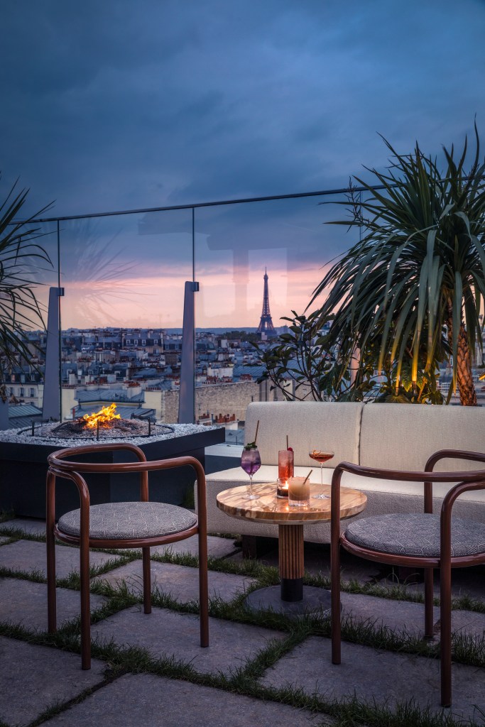 In the upper floors, the rooftop and suspended garden create a dynamic counterpoint. At sunset, deep-hued seating, wrought-iron planters, and textured surfaces glow under the shifting sky. It’s very cool! Guests drift between cocktails, conversations, and views that stretch from the Eiffel Tower to Sacré-Cœur. The suspended garden, quieter and more introspective, invites reading, daydreaming, and the gentle pleasure of being tucked above the rhythm of the city. It’s fabulous, both on a rainy day and in the heat of the summer. Clearly, a new place to be. Staff are also truly dedicated and fantastic.
