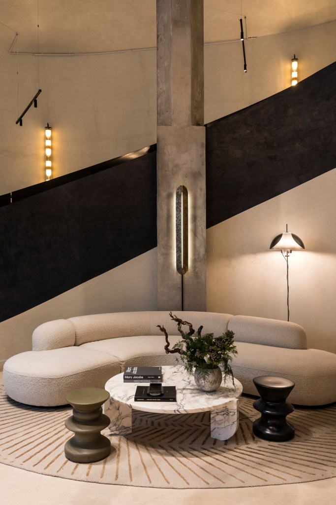 From the street, its brutalist facade remains proudly visible and welcoming. Concrete volumes soar with sculptural intent, punctuated by a glass façade that casts light and shadow across the preserved spiralling ramp, an architectural reminder of the building’s past life. But once inside, the structure becomes a world unto itself: more than 10,000 square meters reimagined by Philippe Chiambaretta Architecte (Aéroville, near Roissy‑Charles‑de‑Gaulle Airport, Gide headquarters etc.) and his multidisciplinary studio PCA-STREAM into an ecosystem that feels at once open, layered, and intensely human. As Marion shares, “The property is called La Fondation because the project was deeply rooted in the original foundations of the building. The restructuring (which lasted six years) was guided by a commitment to preserving and transforming the existing structure. Former office spaces became the hotel and restaurant, a parking garage was reimagined as offices, and a former photo studio was converted into a fitness center.” It took a long time and the resulting spaces are fantastic.