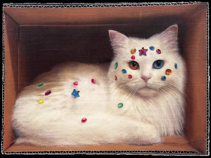 Jones works at an intimate scale, placing his paintings at the intersection of portraiture and still life. His recurring subjects, cats and flowers, are meticulously rendered. Rather than direct observations, they are staged and embellished in ways that echo the logic of digital image-making. Like a pet owner arranging a photograph, Jones selects environments and details less for narrative than for painterly tension.