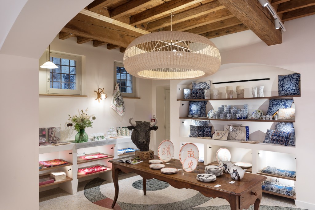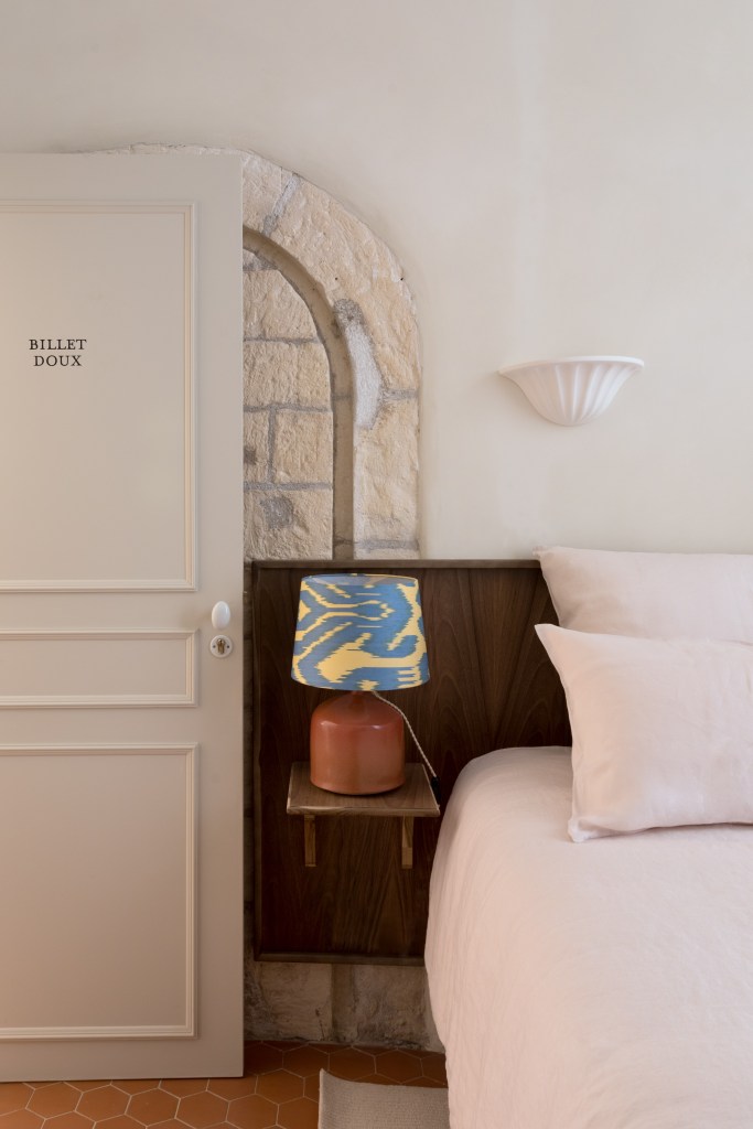 “We collaborated with several artisans and creators to bring this place to life, but the decoration was imagined and sourced directly by Agnès and Françoise Costa, who infused each space with the soul and elegance of the South. For the ground-floor boutique, the lighting was created by Atelier Vime, a benchmark in Provençal basketry and design, while the Venetian terrazzo floors were custom-made by Arles-based artisans Tonnello. Every detail was carefully considered: walnut shelving recalls apothecary shops, while the rooms combine sourced furniture, rattan seating, dark wood headboards, and immaculate arches. The result is a décor that is sober, warm, and deeply rooted in the Mediterranean art of living.”