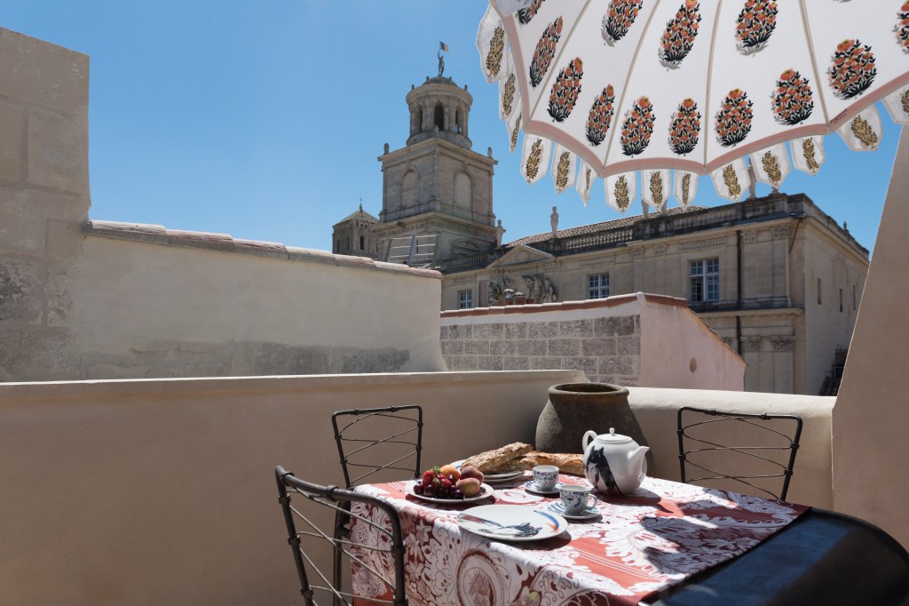 The third floor is where the maison’s narrative reaches its crescendo. Secret Absolu Suite blends antique Arlesian furniture, gilded overmantels, and Italian designer lamps in a layered, curated space. Guests enjoy exclusive access to a terrace overlooking the rooftops, the Hôtel de Ville, and the city’s iconic clock tower of the City Hall. It’s beautiful and fully immersive. The suite also includes an extra wrought-iron bed for a third guest, a large bathroom with double washbasin (and Fragonard toiletry products of course), bath and shower, and a fully equipped kitchen, perfect for an aperitif to enjoy outdoors as the sun sets.