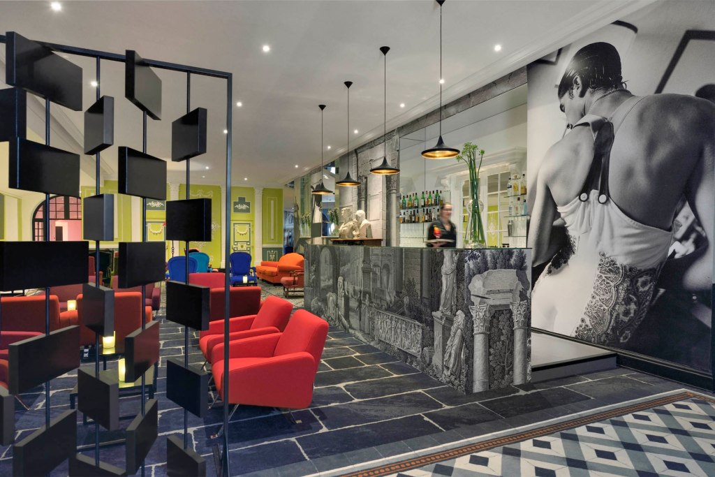 Guests enjoy a nice cocktail in the bar, or wait for their friends while reading fashion and art magazines on orange, red, yellow and green sofas. Fornasetti-style scenes of Arles, Arlésiennes posing before the Roman theatre (which today hosts flamenco concerts in the summer), among other motifs, enliven the space, which is further adorned with antique sculptures and busts. In the lobby, La Valise Arlésienne presents a display of vintage photography, featuring old cameras and photographic objects, dialoguing with old posters of La Feria. In the summer, that space is activated with concerts and live music.