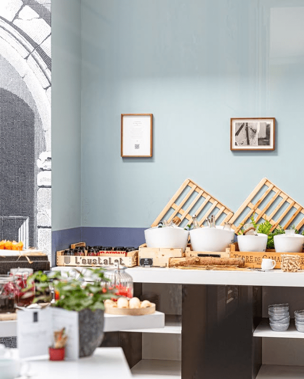 The rooms reflect the same philosophy, blending comfort, practicality, and artistry. An antique chair is painted in black and white, a nod to Van Gogh’s paintings probably, and the beds are extra comfortable. Fully air-conditioned and illuminated by natural light (it can be really hot and sunny in Arles in the summer), the hotel feels at once airy and grounded too. The outside pool is also amazing. From Classic Single Rooms for the solo traveller to expansive suites suitable for families, every room is designed to balance historical charm with modern convenience. Deep bathtubs, plush bedding, minibars, coffee machines with Noailles capsules, Jardin d’Asie tea, and flat-screen televisions coexist harmoniously with bold fabrics.