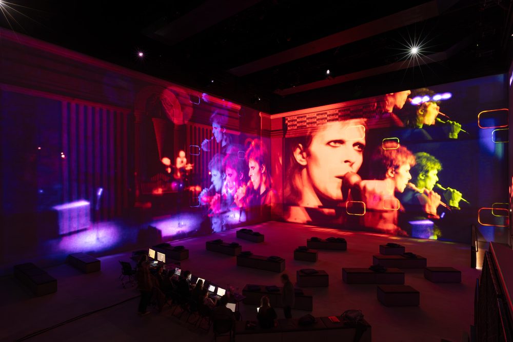 The space is designed to impress. Walls, floors, and ceilings pulse with imagery, while HOLOPLOT spatial audio surrounds visitors with sound, from the haunting strains of Young Americans to the energy of Let’s Dance. Every step feels choreographed.