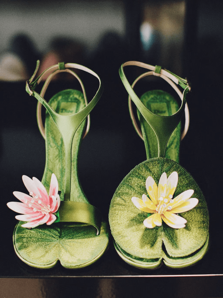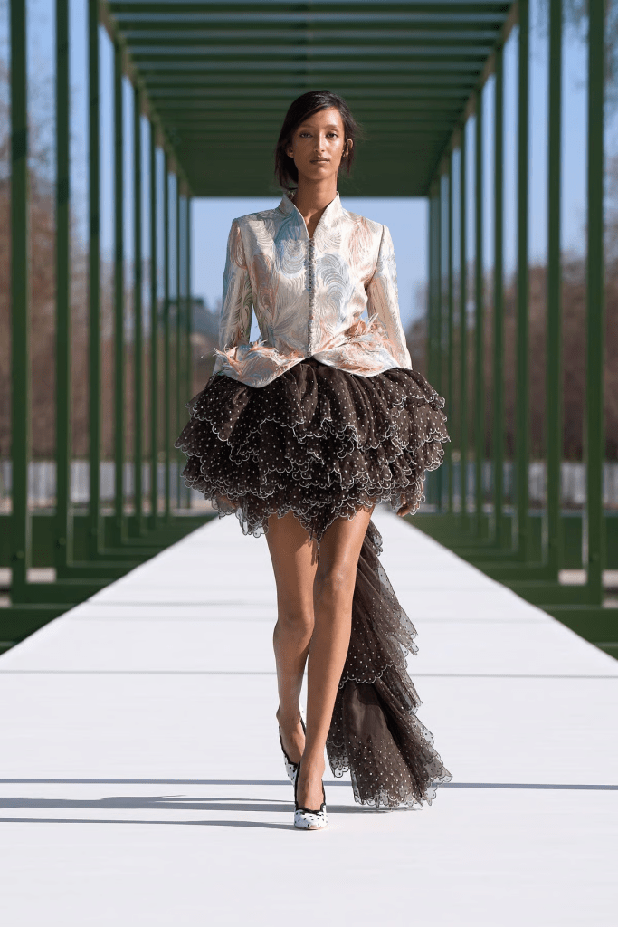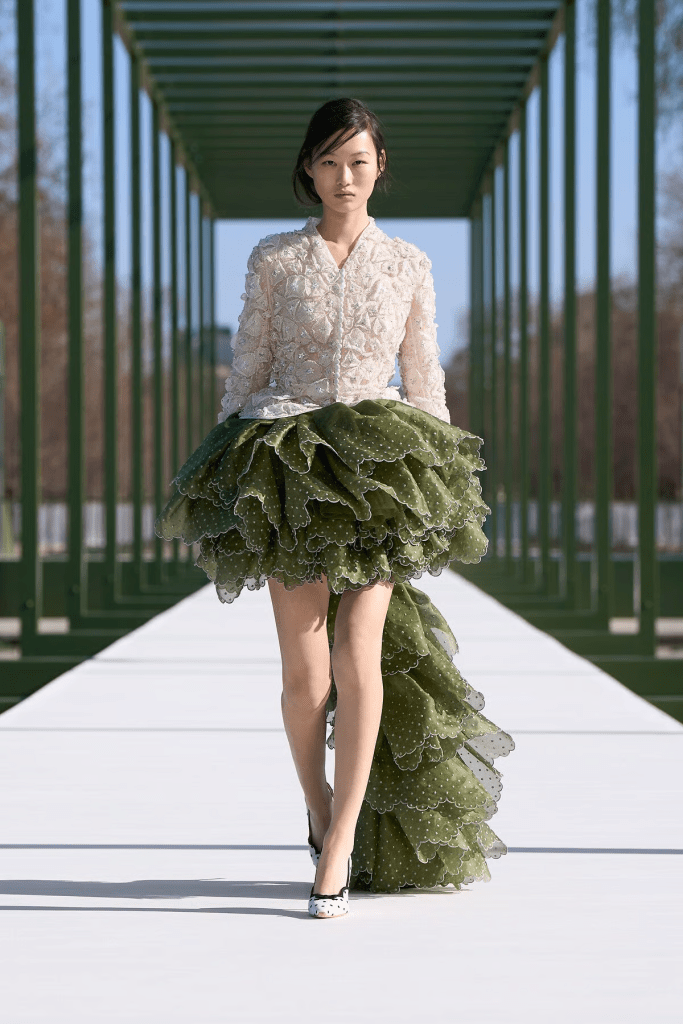 The collection itself mirrored this botanical inspiration: ruffled tulle skirts, peplum blazers, and sculpted jackets referenced Dior’s heritage, while flower-shaped dresses and subtle waterlily motifs evoked the world of Dior. Textural details such as ostrich-feather trimming, shimmering sequins, and silver-coated denim played with light and movement, recalling the delicate interplay of petals and leaves.