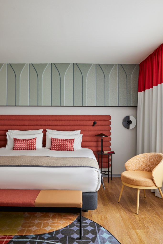Guests are greeted by a reception adorned with hanging lamps inspired by the chimneys of Catalonia’s industrial era, a pivotal period in the region’s economic and commercial history. The colourful pendant lights also echo the three famous chimneys on Avinguda del Parallel, one of Barcelona’s liveliest streets for culture and entertainment, just a 15-minute stroll from the hotel. The corridor carpets guiding guests to their rooms echo the streets of Barcelona, adorned with the city’s iconic flower-shaped tiles, known as panot.