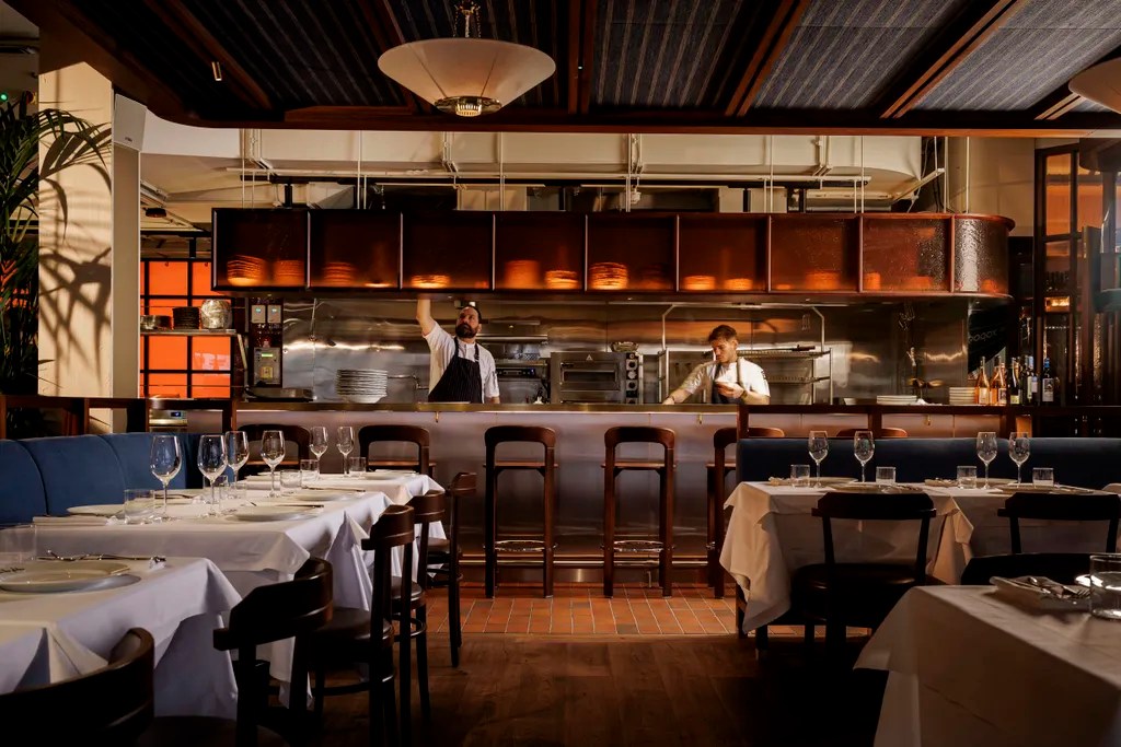 Designed by Archer Humphryes Architects, the 90-seat restaurant unfolds across two levels. Hints of blue in the signage, logo and banquettes nod to the iconic hues of Greece, while warm blood-orange and green tiles add vibrancy to the space. Guests enter through an ultra-chic cocktail bar with a woven wicker ceiling and DJ booth, where a vintage sound system spins vinyl before the room opens onto an open kitchen centred around a chargrill.