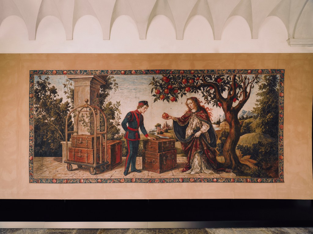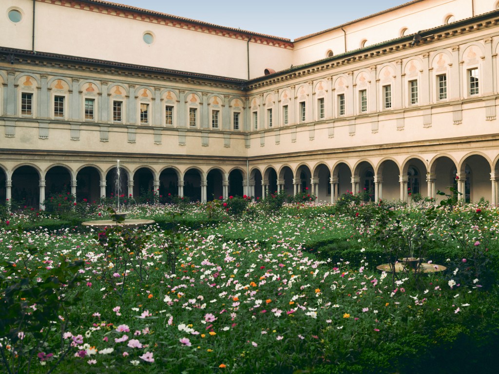 The installation extends into the cloister spaces, where a garden of seasonal flowers references the Flora motif, translating a signature house code into a physical environment. In a smaller cloister, an interactive installation of vending machines dispenses drinks linked to character archetypes from Gucci Giardino, turning identity into a playful system of chance and selection. Together, these elements expand the exhibition beyond static display, using craft, narrative, and environment to reflect on how the house continually reconstructs its own visual language.